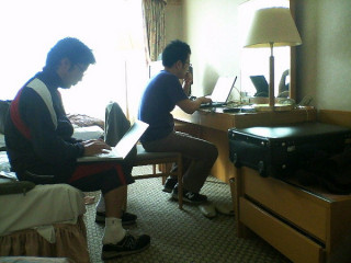 こちらは、まだ出発前の、ホテルの部屋の西本アニキと宇宙部べいキャプテン。朝起きるなり、ノートブックとめがねとニューバランスを完全装備して、ネット開始!あの〜、そろそろ街にくり出さない?