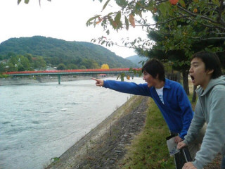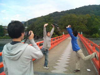 朝霧橋という橋の上でチーム鳳凰の決めポーズをキメる西田くんとみっちゃん。それを撮るぐっさん。