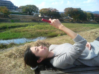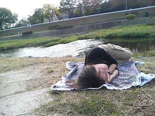 さて、鴨川ぞいにやってまいりまして。ころあいのいいベンチ発見。野外昼寝協会会員としては、ここで、活動すべきではないか。