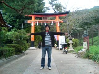宇治上神社に到着。ここも世界遺産。鳥井くん、とりいがあるよ!鳥井くんがこっそりととりいの前でポーズを、、どうやら鳥井家に伝わる、秘伝のポーズだったみたいです。