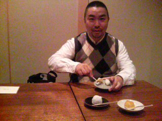 女子社員たちがビールをかっくらったり、川べりで寝たりしているあいだに、いい年した男3人組は抹茶と和菓子。