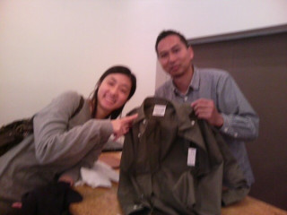 中年チームが羨ましくなったので我々もモリカゲシャツへ。なんこちゃん、おかいあげ!あたくしも、おかいあげ!なんこの右側が、モリカゲシャツのご主人、モリカゲさん。わーい!買い物は楽しい〜。