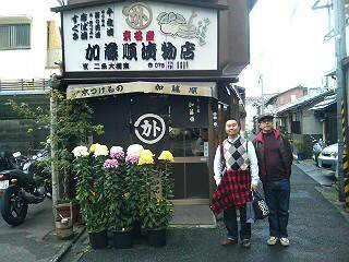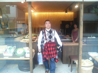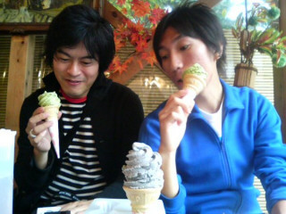 宇治川のほとりの甘味処で抹茶のスウィーツで幸せになる男ふたり。手前に写っているのは、ぼくの黒ゴマソフトです。