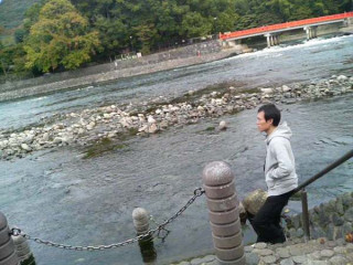 宇治川のほとりで背筋のよい男ひとり。お茶、飲んで帰ろう。
