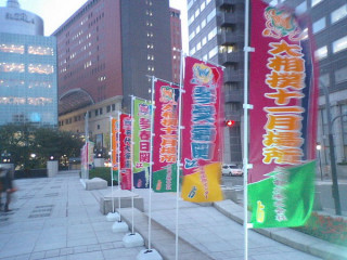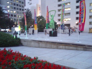 銅像の女性が踊り、花壇の花は寒そうに体を寄せ合い、お相撲の力士の旗が秋風にゆられ、はためいてます。ただ今、福岡市役所前。大相撲11月場所は福岡なんですね。