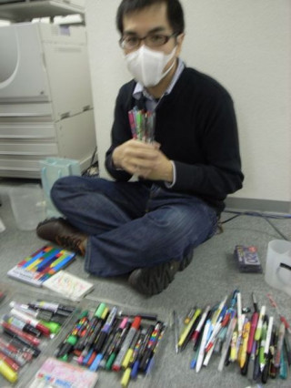 こちら、ペーソス・・二等兵。司令官・の指示のもと、会社のペンを整理中。「ボールペンがね、 たくさんあるから、 引き出しをひとつ ボールペンだけで作りたいんですが、 司令官はダメだというんです。 でも、 懇願をしてみたら、 許可をいただきました!」がんばれ! 二等兵!