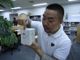 こちらの立方体には、 このようなイラストが 書かれております。 文字とイラストは、 弊社社長が描いたものでございます。