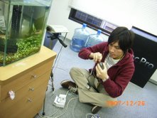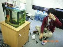 おや、 なにやらフグ水槽のうしろに あやしい人影発見! と思ったら、バイトの先輩の、 みっちーさんでした。