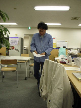 「もぎちゃ〜ん。 投げ文がきた! 投げ文!」おお、あれがとうとうついに!って、それは校正なのだから、喜んでる場合じゃないのであります!ちなみに、この投げ文をもって近づいてくるという写真は、さんに再現をしてもらったものです。普段は、絶対にそういうことをしてくれませんが、勢いをもってして、お願いをしたらしてくれました。曰く、「オレの一世一代の 小芝居だ!」と。あいや、こんなことをしてないで、修正せねば〜!
