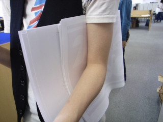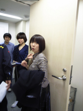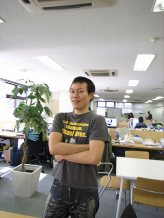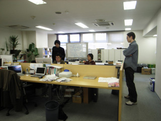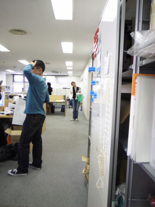 きのうは、同じシャツをきてそっくりさんぶりをアピールしていた二人。今日も微妙にそっくりさん。って、メガネかけてるだけだっつうの。先ほどの校正の結果をに持っていったところでした。