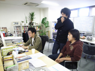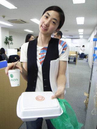 ちょっと前に、さかんに会議をしていたハラマキチームですが、いまは、具体的なデザインの話をしているようです。ああああ、むこうからちゃんがやってきました。わたしが興味が有るのは、べんとうではなく!その小脇に抱えたデザイン画のほう〜。「もうちょっと まっててね〜ん。」