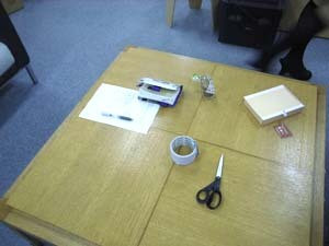 お茶、お茶〜TV前のテーブルを横切ろうとしたら、誰か手帳置きっぱなし。お菓子食べっぱなし。メモ書きっぱなし。はさみもガムテープも出しっぱなし。おお〜い!だれだ〜?あ、このシール貼りまくりの手帳。おお〜い、さ〜ん。また に怒られますよ〜。すましてもダメですよ。