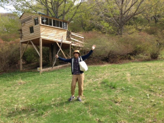 福田利之さんと、気仙沼のツリーハウスに来てます!はじめて来ました、サイコーです!鳥の声がー。新緑がー。これからここでコーヒーをいれるのです。いずれカッパとウサギでコンテンツにしますね。あー、すごい、ここは!