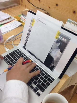 なにしてるんですか、と聞くと 「トレースするんだよー」とのこと。 ああ、トレース台みたいに 使おうと思ったんですね。 残念ながらパソコンの画面の光は微弱で、 下絵は全く透けていません。