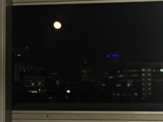 窓の外を見ると、 満月からは2日経ってますが、 オレンジ色の大きな月が! (iPhoneでうまく撮れずすみません)