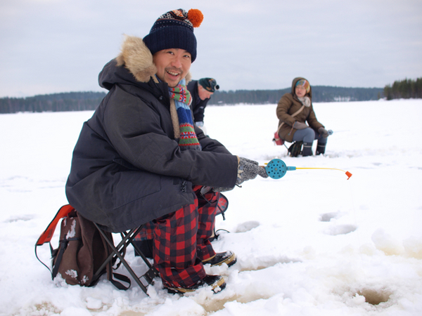 凍った湖上で釣りに挑戦しました。