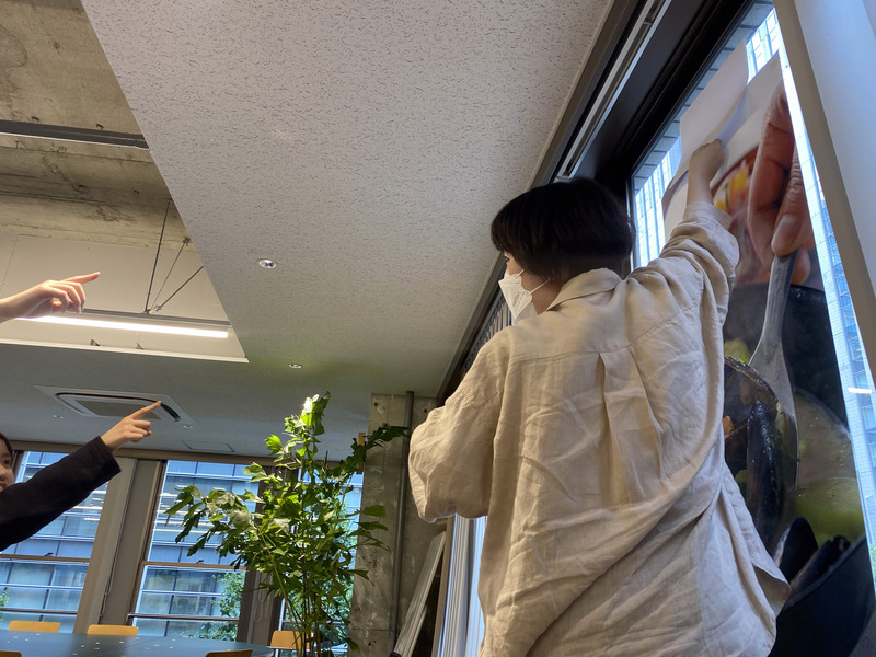 壁になにかを貼っている