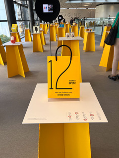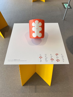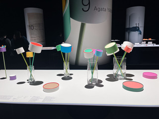 2階にあがると、華やかなパッケージが目に飛び込んできて、すごく心がおどりました。パッケージを置く黄色の台も、竹尾さんの紙でできているそうです。