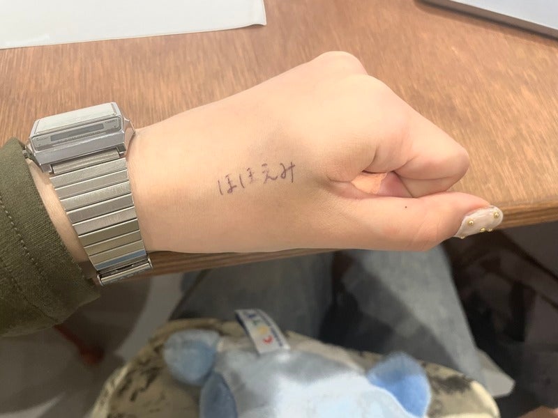 手にほほえみと書きました。