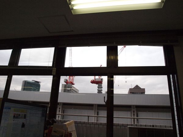 窓から見えるとなりの建物のクレーンが