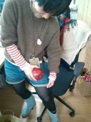 りんごを磨く人にはさまれるなんて