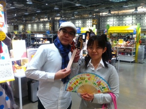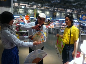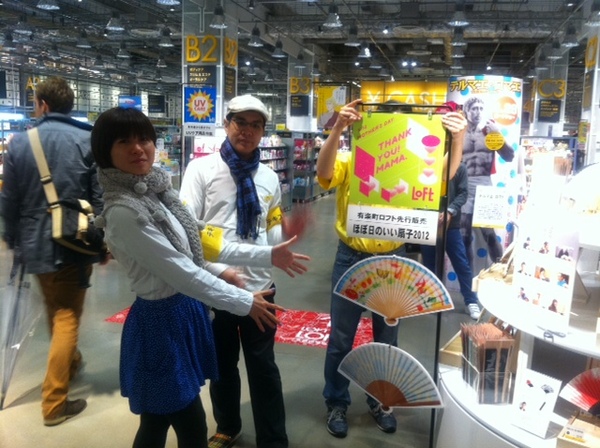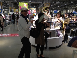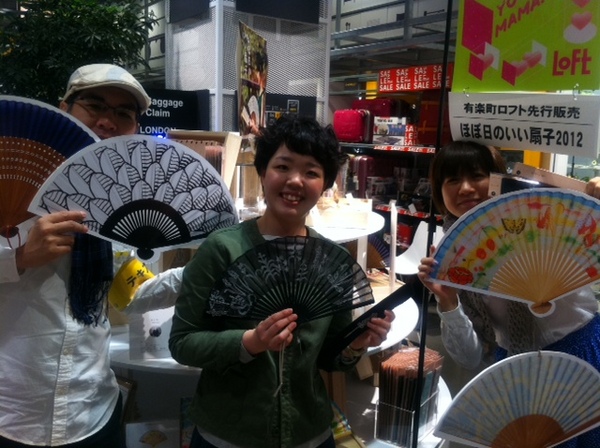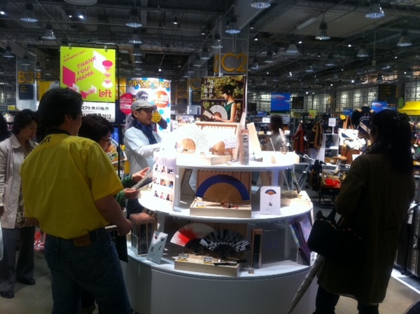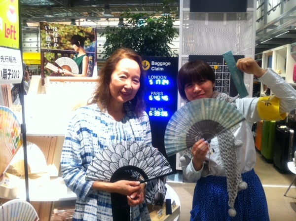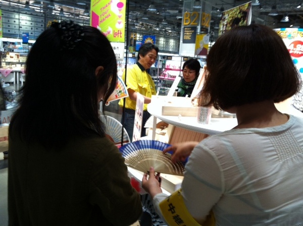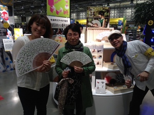 扇子チームリーダー・ちながこころを込めての接客を。つたないですが一所懸命。13種の扇子実現のためにずっとがんばった、ちな。きょうはたいへんうれしそうです。来てくださっているお客様もみなさん笑顔でありがたいです。お、向こうに見えるは売り場のプロフェッショナル、細井さん。さすがの接客術!
