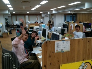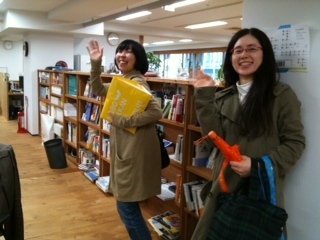 2時からお当番の外山&小野のふたりが「すみませーん!!」と平謝りしながら登場しました。おお。遅かったな。40分のちこくだぞ。ふたりの平謝りがすばやすぎて写真がちゃんと撮れません。「すみません!私が自信満々に案内した道が、どういうわけか真逆の方向で、迷いまくってしまいました!」ふたりは雨の有楽町を小一時間さまよっていたらしい。まぁ、無事についてよかったよ。交代でよろしくね。ゆーないと&山下とともにお昼休憩にはいります。