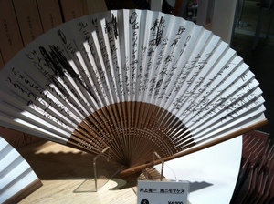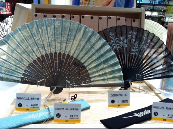 扇子売り場をもようがえちゅうです。昨日、外山がバタバタと作っていた扇子パネルをモビール風につるしました。これを目印にお越しくださーい。