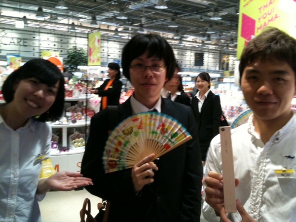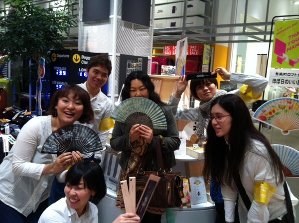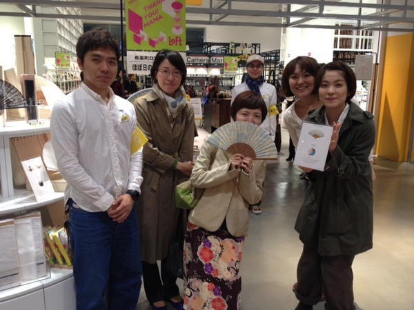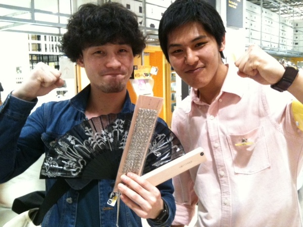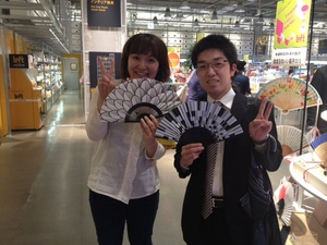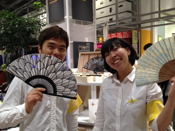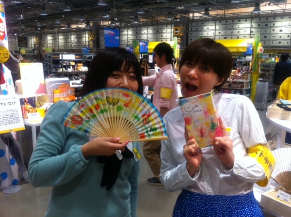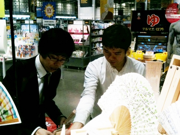 さきほど、たぐちが到着しました〜。かけつけるなり、「扇子、扇子」とあつがってあおいでおります。となりに写っているとやまとはデザインチームで先輩後輩の関係でもあります。このツーショットは珍しいのだとか。そんなふたりからお知らせです。本日の有楽町ロフトの営業時間は、21時30分までです〜。閉店時間までイベントやっておりますので有楽町近くにお越しになるかたは、よろしければ、お立ち寄りください!