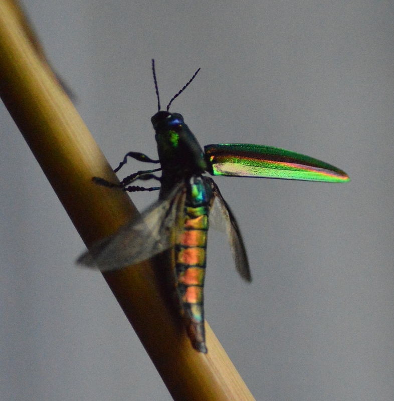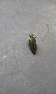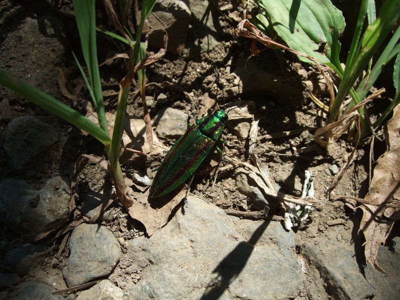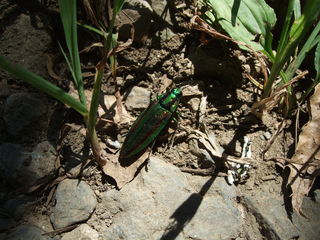 私は山口市の中心から少し離れた、 椹野川という2級河川の傍に住んでいます。 自然豊かな河川でして、 夜には灯りに向かってたくさんの虫たちが、 アパートに集まってきます。 たまにカブトムシも窓に激突してきます。 私の部屋は3階なのですが、翌朝玄関を出ると、 鳥に食べられたのか、セミや甲虫の羽が 散乱していることがよくあります。 それはもう見事と言いたくなるくらい、 羽だけです。 そのなかに、決して頻繁に というわけではありませんが、 タマムシのものと思われる細長い、 独特の光沢をもった羽が 落ちていることがあります。 初めて見たときは、 私も法隆寺の玉虫厨子を思い出し、やはり 「タマムシって こんなに身近にいるものなんだぁ」 と感動したものです。 残念ながら、生きた個体は見たことはなく、 これが私のタマムシ目撃のすべてです。 参考になるかはわかりませんが、 お役にたてば幸いです。 (ザッキー) |