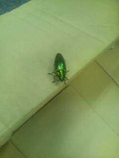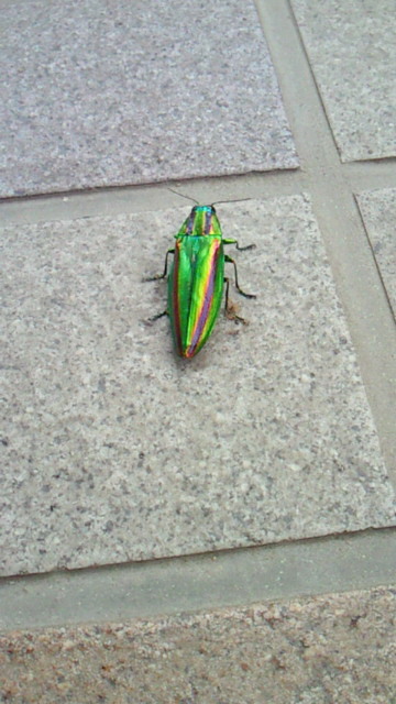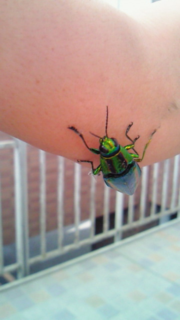 タマムシ…美しいなぁと思いながら 記事を読んだのが昨日でした。 で、なんと、今日の昼休みに 部長が連れて帰ってきました! みんなで、写真撮影しましたが、 この美しさ携帯カメラでは難しいかも…