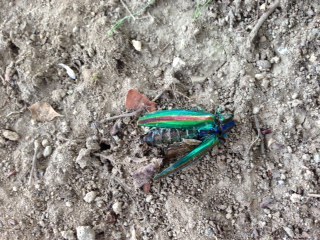 仰向けにひっくり返った 細長いその虫のお腹は 緑と茶色(?)っぽい、 きらきらした感じのきれいな色をしていて、 そのあと自力でうつぶせに戻ると、 高く飛んで行ってしまいました。 うつぶせに戻ったときに見た背中も、 緑がベースで茶色(?)の線が 入ったきれいな色をしていました。