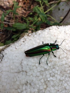 ちなみに、タマムシ類は美しい種類が多く、 アオタマムシは憧れの種です。 タマムシほど大きくはありませんが、 金属光沢がはんぱないらしいです。 モミノキの枯れ木に来るそうで、 いつか見たいと思っています。