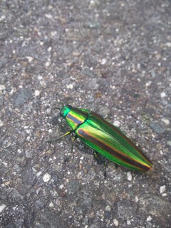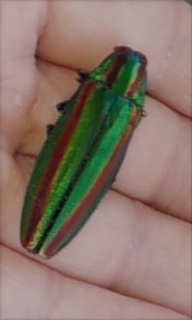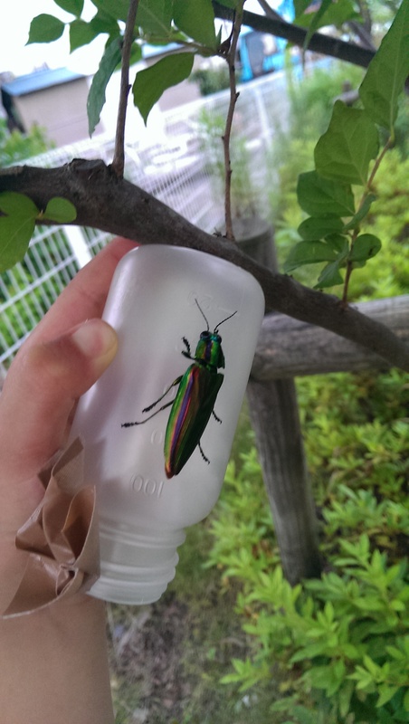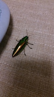 それがタマムシでした。 捕まえて!!!とお願いしたのですが ほぼ死んでしまっていて ありんこにたかられていたとのことで 捕獲はままならなかったのですが 23区内でも タマムシっているんだなあと思いました。