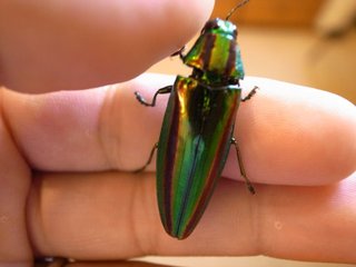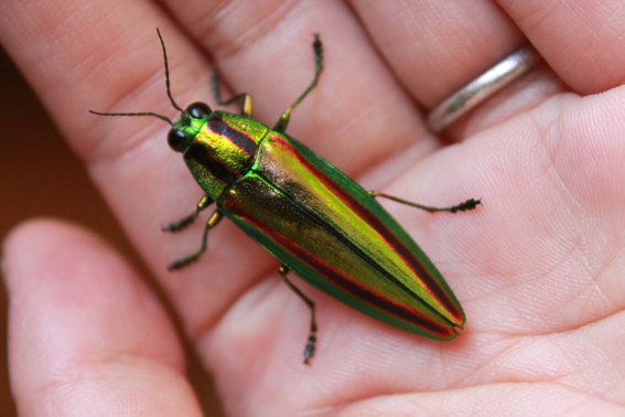 そんでもって、昨日、 福岡県久留米市田主丸町に 子供2人と東京から来た義父と 1週間後に出産予定日を控える嫁と 5人でぶどう狩りに行くと、 「パタパタ」と羽音をたてて 玉虫が飛んできたので、 素手で捕獲しました。 およそ、30分ぐらいの滞在で 捕まえることが出来たので、 まだまだいると思います。(たぶん) (福岡県・U) |