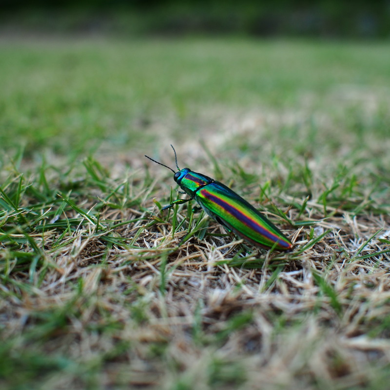 玉虫情報送りますね。 先日14日の18時ごろですね。 暑い日でした。 いつもお散歩に行く公園の芝生をのんびりと 歩行している玉虫さんに会いました。 めずらしいので記念写真を撮りました。 ここら辺でもめったに見ないですね。