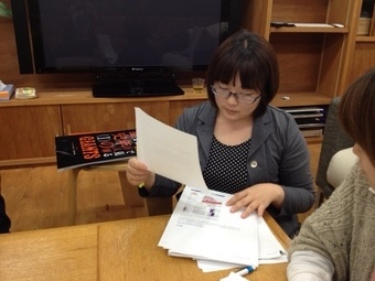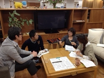 ほぼ日手帳ストアページの編集会議中、 おもむろにニュースキャスターのような雰囲気で たくさんの資料を読みはじめる 。