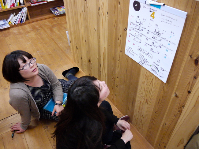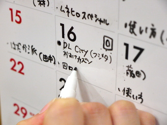 デザイナー の横には、 手帳ページの進行カレンダーがはってある。