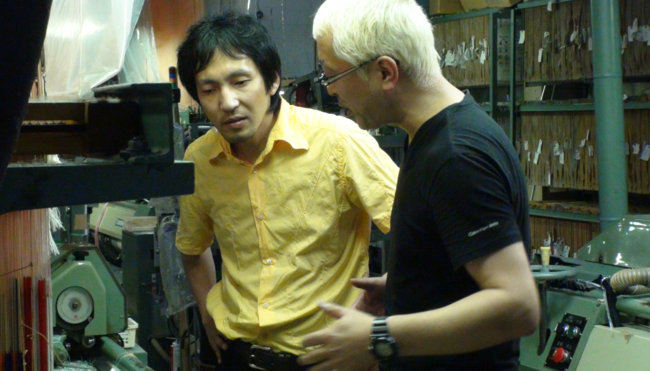 黄色い服を着ているのが、 今回も、魅力的な生地を 提案くださった牧野さん。 織機を前に、 牧野さんがお話ししている相手は 株式会社ミタショーの三田さんです。