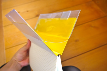 3、 で、ここがポイントです! 切り込みの入っているシートが 薄くなっているところを、 爪先でグッと力を入れて押さえます。