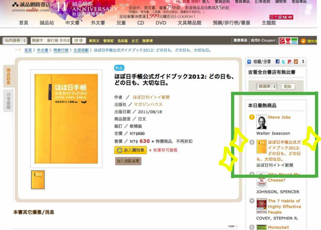 台湾にある誠品書店の 「最熱商品」ランキングで 「ほぼ日手帳公式ガイドブック」が 2位にランクインしている! あの、世界中で大反響を呼んでいる スティーブ・ジョブスの 伝記に次いで、です!