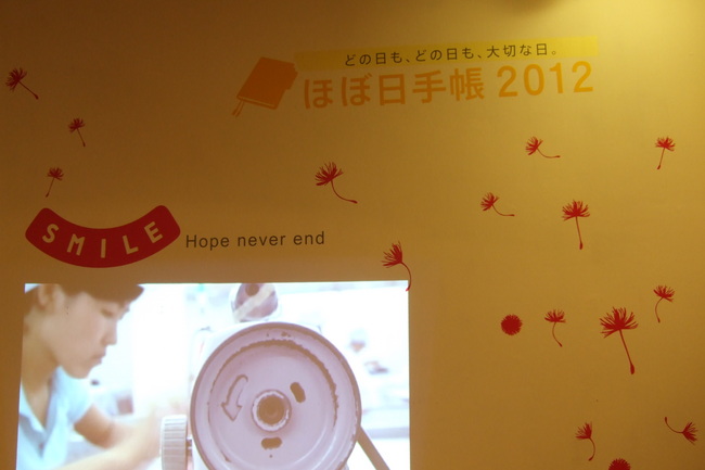 壁には、プロジェクターでうつしだした 「SMILE」の動画が。 売場にはあのメロディーが 鳴り響いているそうです。 台湾のみなさんも、 Shake your hands〜♪