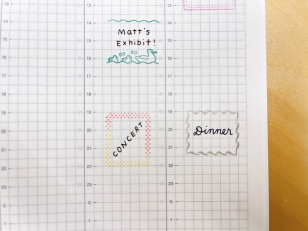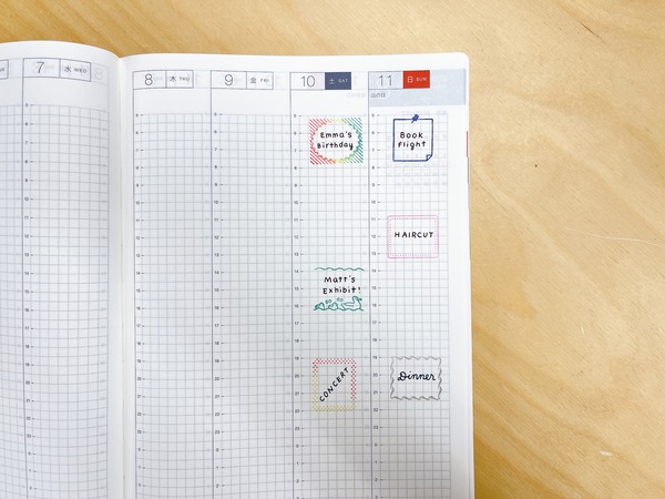 When you stamp them sideways, they cover 2-2.5 hours worth of grids, and 3 hours vertically (they vary by design) so you can also use them to mark plans that take up a few hours, like going to a concert, visiting an exhibition, going out for dinner or having your haircut!