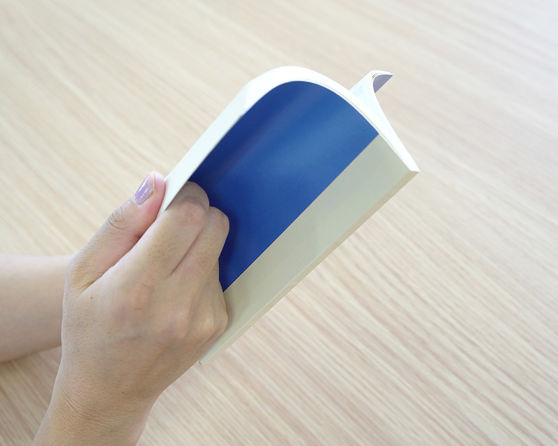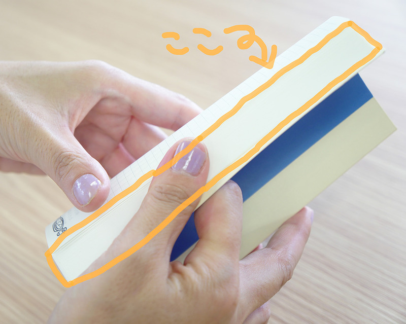 人差し指と中指で裏表紙を支えて強めに紙をしならせる。