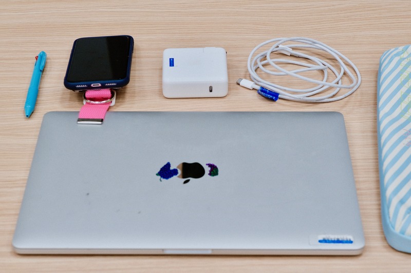 ▲15インチの大型ノートPC、アダプタ、ケーブル、iPhoneを..。