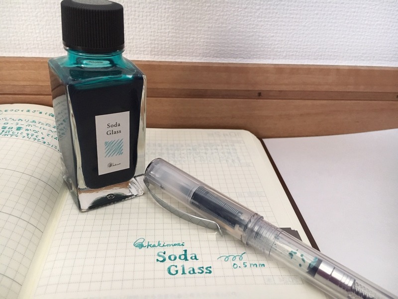 ▲これがkakimoriのペン。Soda Glassという名前のインクを入れて使っています。インクの色までいいから、さらに書く意欲を掻き立てられます。