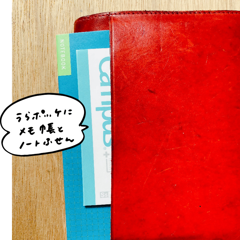 ▲KITTAとポストイットはカバーの内ポケットに。ほとんど厚みがでません。