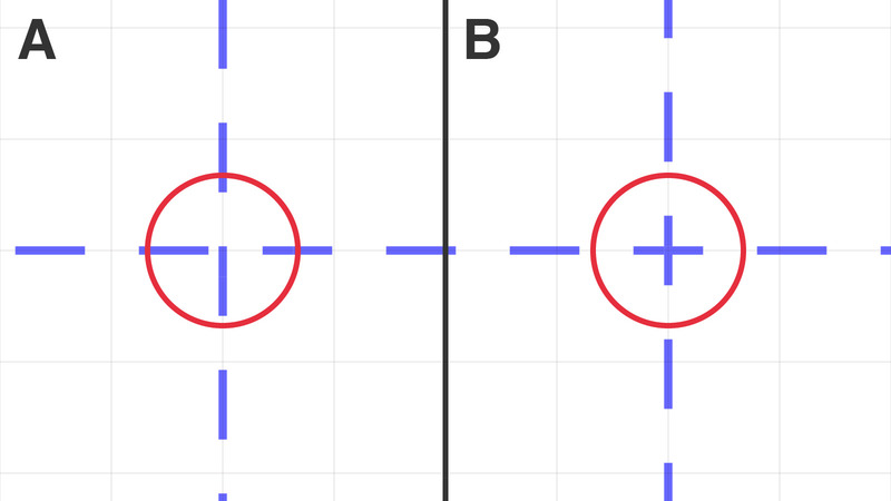 ▲方眼の点線の交点部分をの模式図。左Aが以前の交点、右Bが2009年以降の交点。交点が十字になっている。
