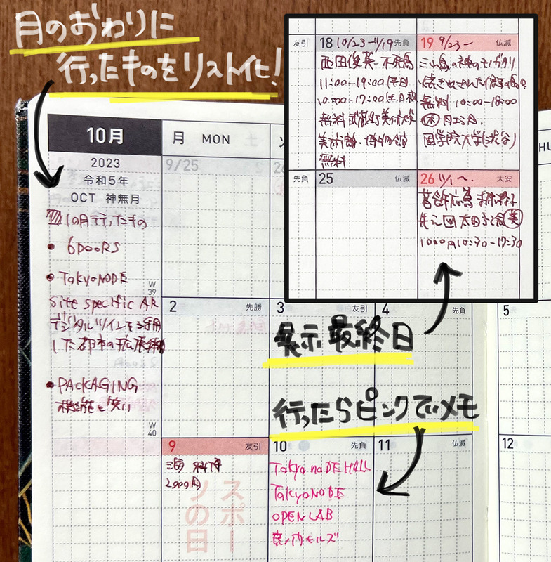▼月間カレンダー、年間インデックス、週間ページの使い方