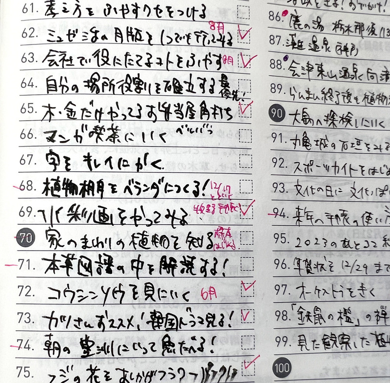67番「字をキレイにかく」。その後も全然意識していませんね。100番が空欄なのは、12月下旬現在、まだやりたいことに出会えるのではないかとネバっているところです。